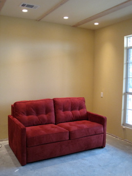 It’s a sleeper sofa. The bed is a queen-size platform bed with a surprisingly comfortable mattress. Platform means there are no bars to press into your back at night. It’s one solid surface beneath the mattress. We are about to have a new guest space.