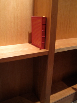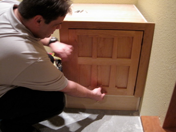 The Big M holds up a door for one of the new cabinets: