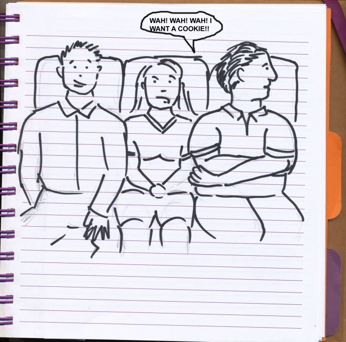 Her mother’s tone of voice immediately makes it clear that the child will be an ongoing problem on this flight. This is one of those mothers who mollifies, who gives in to the child’s demands, thereby ensuring that the demands will continue.
