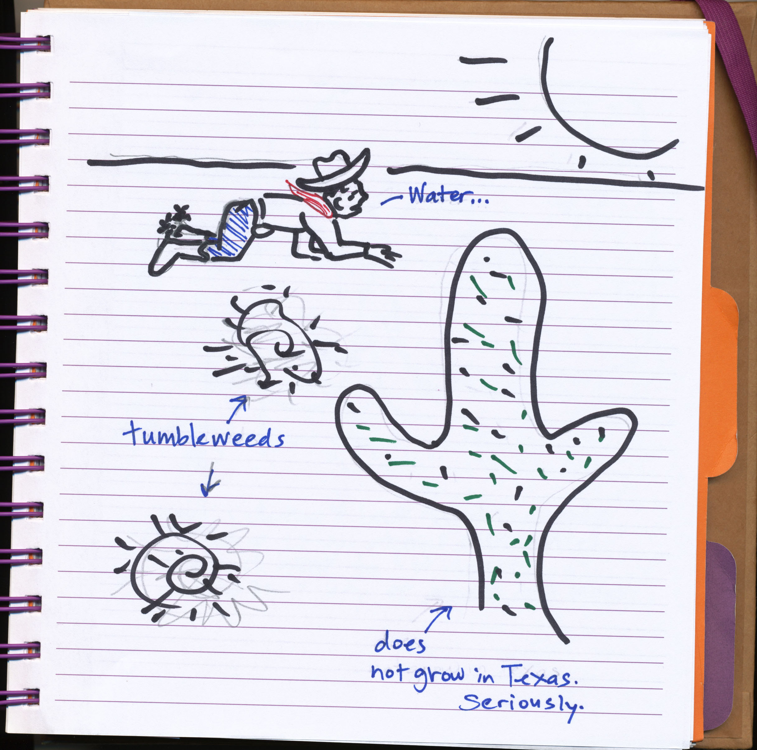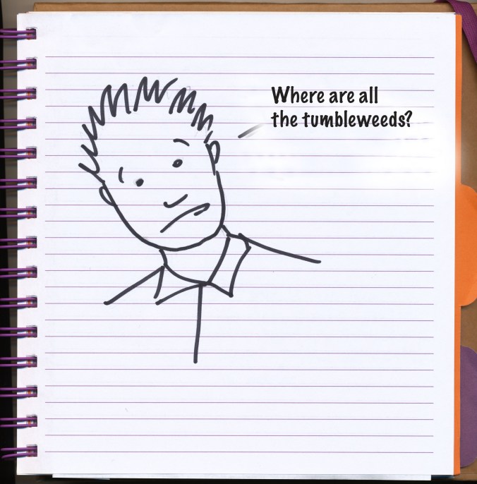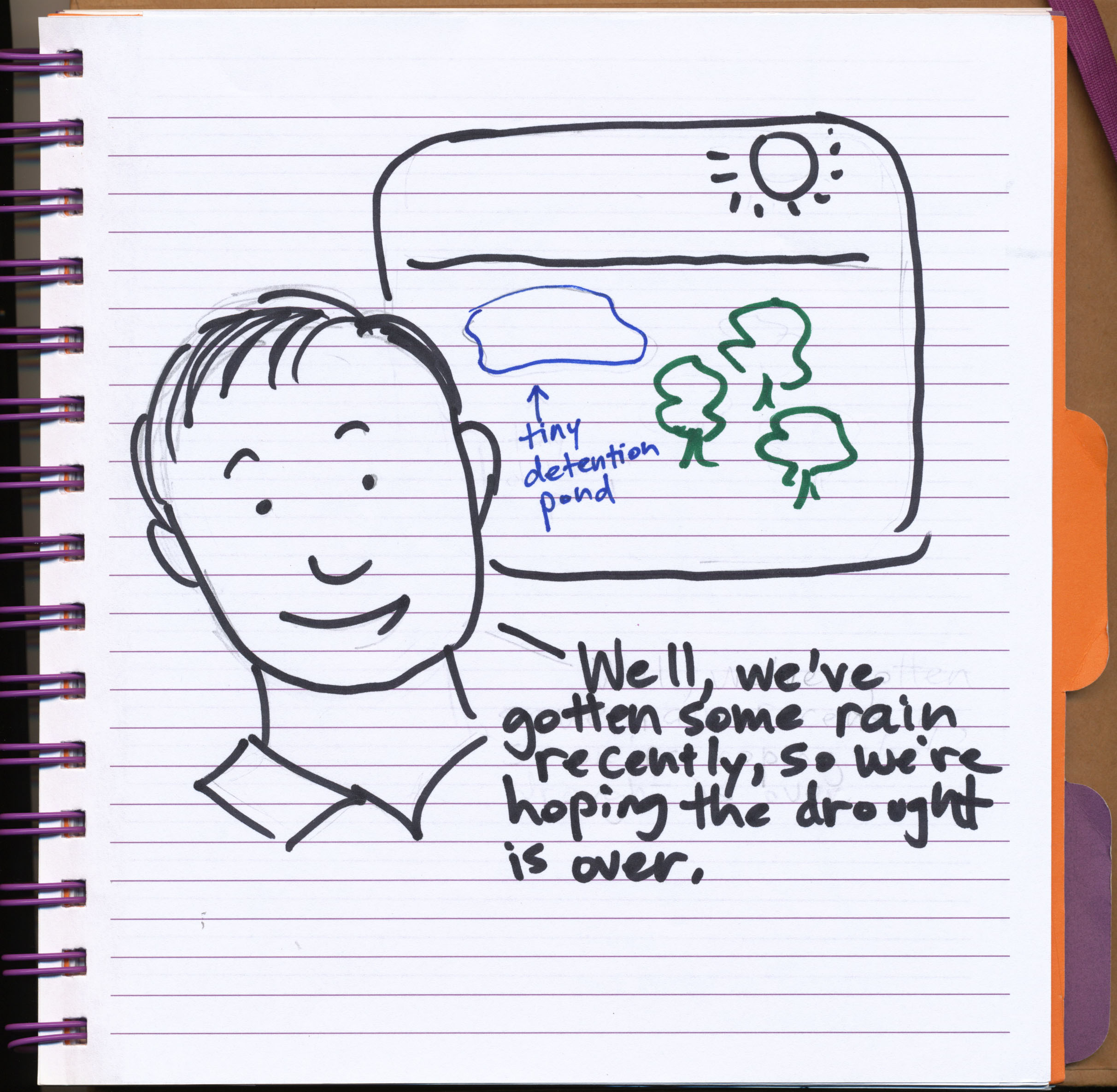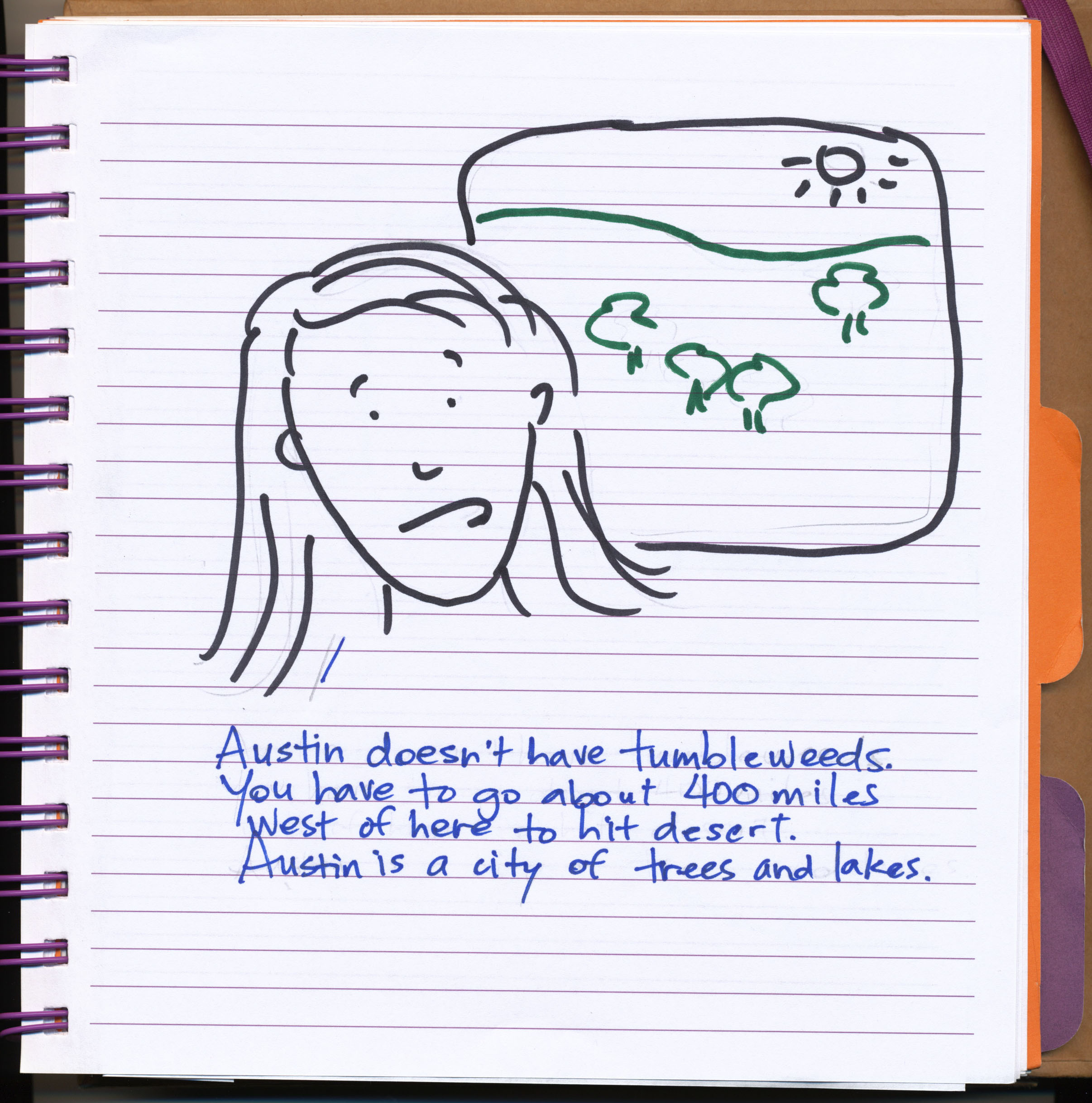 The Big M is a native of Iowa, so he doesn’t realize that Stranger isn’t noting our increased rainfall over last year. I’m a central Texas native, and since my childhood I’ve encountered people like Stranger all over the place, people who’ve only seen Hollywood’s version of Texas (filmed in Arizona). I had a lively conversation a few years ago with some New Yorkers who wouldn’t believe I don’t ride a horse down the streets of my city.