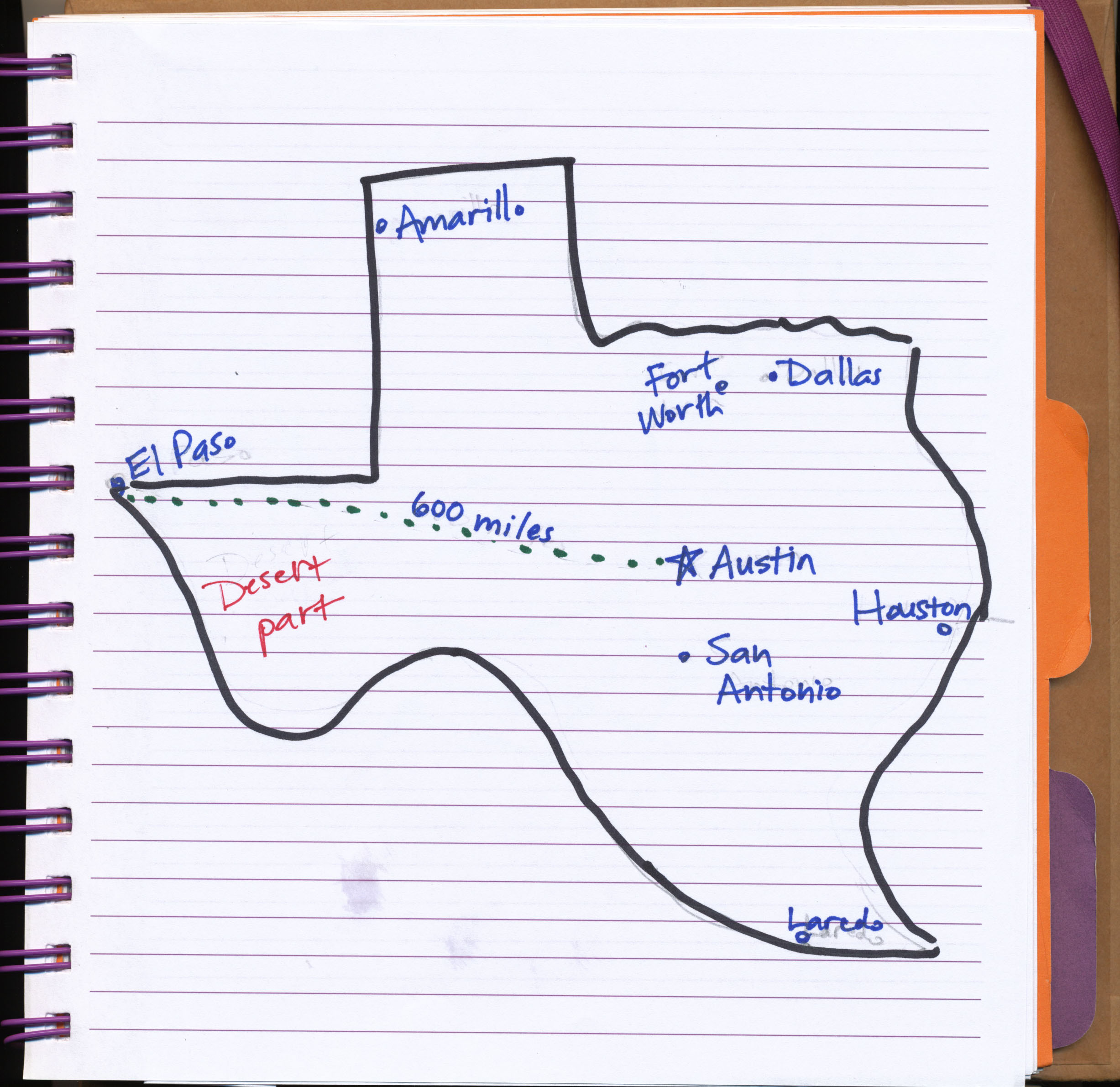 I drew this map from memory. I think all Texas schoolchildren should be required to be able to draw from memory a passable map of Texas and its major cities before graduating.