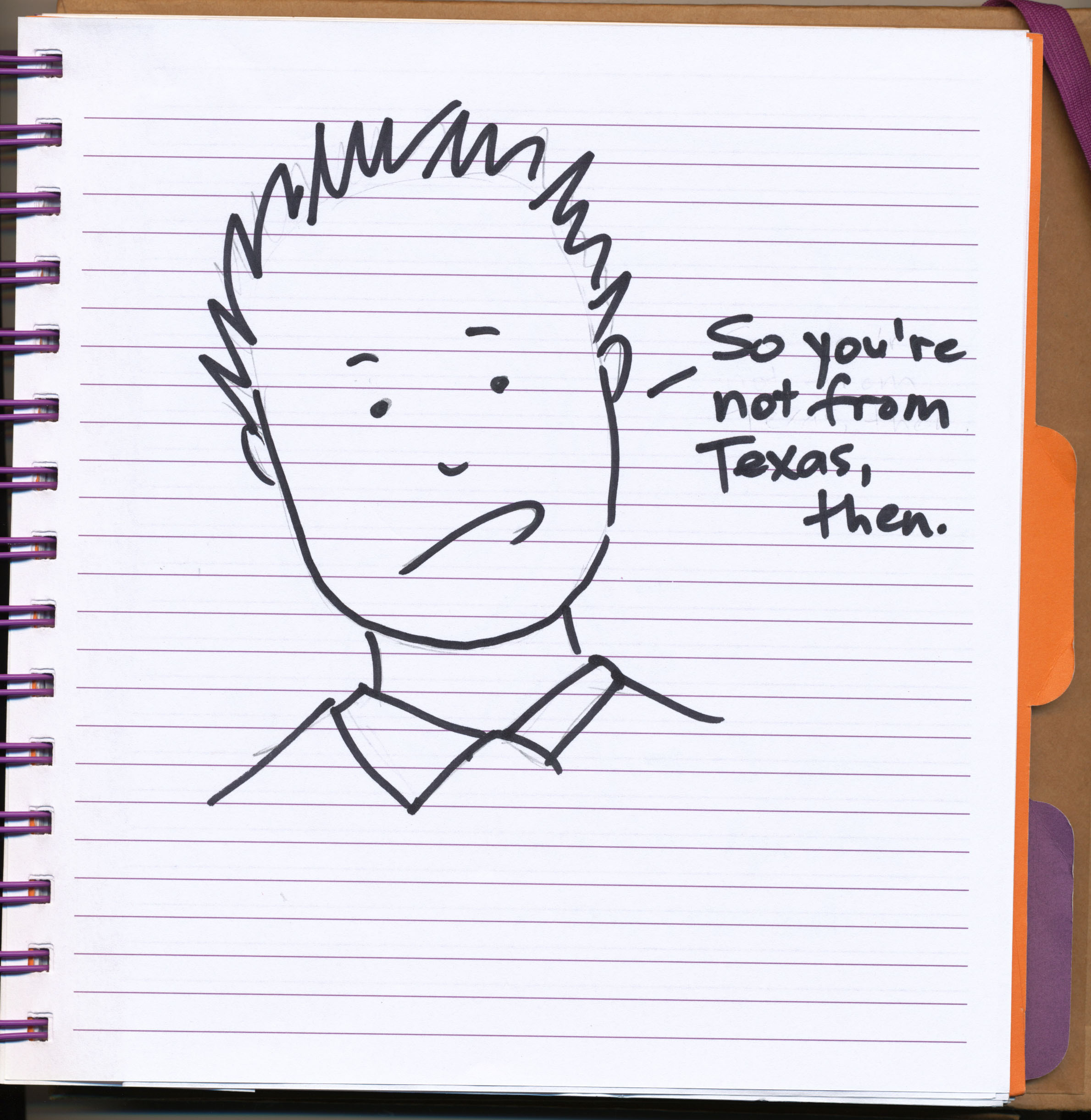 After 3 1/2 hours we begin our approach into Austin. Stranger leans over to me.