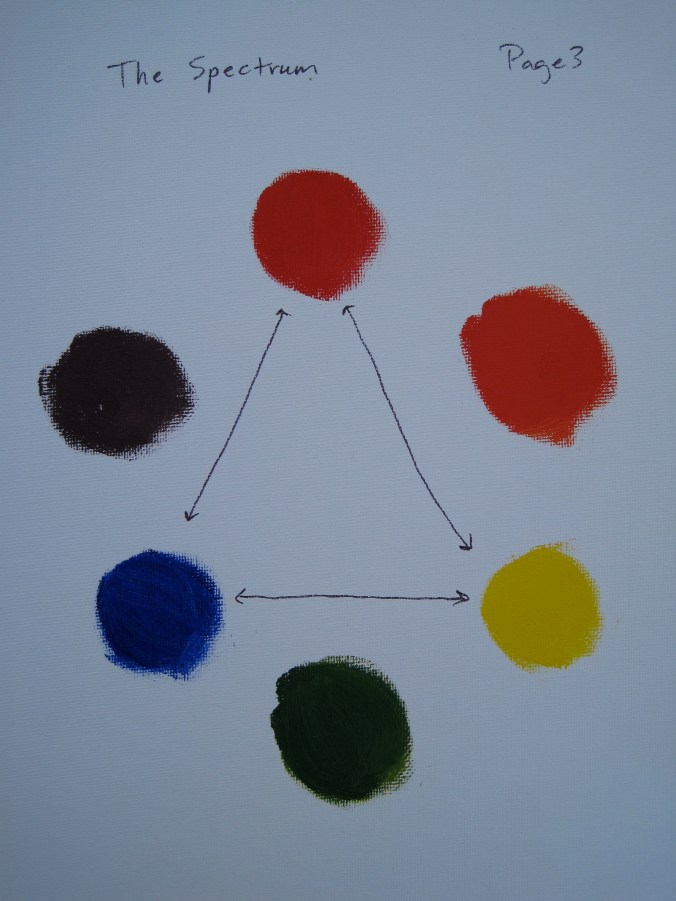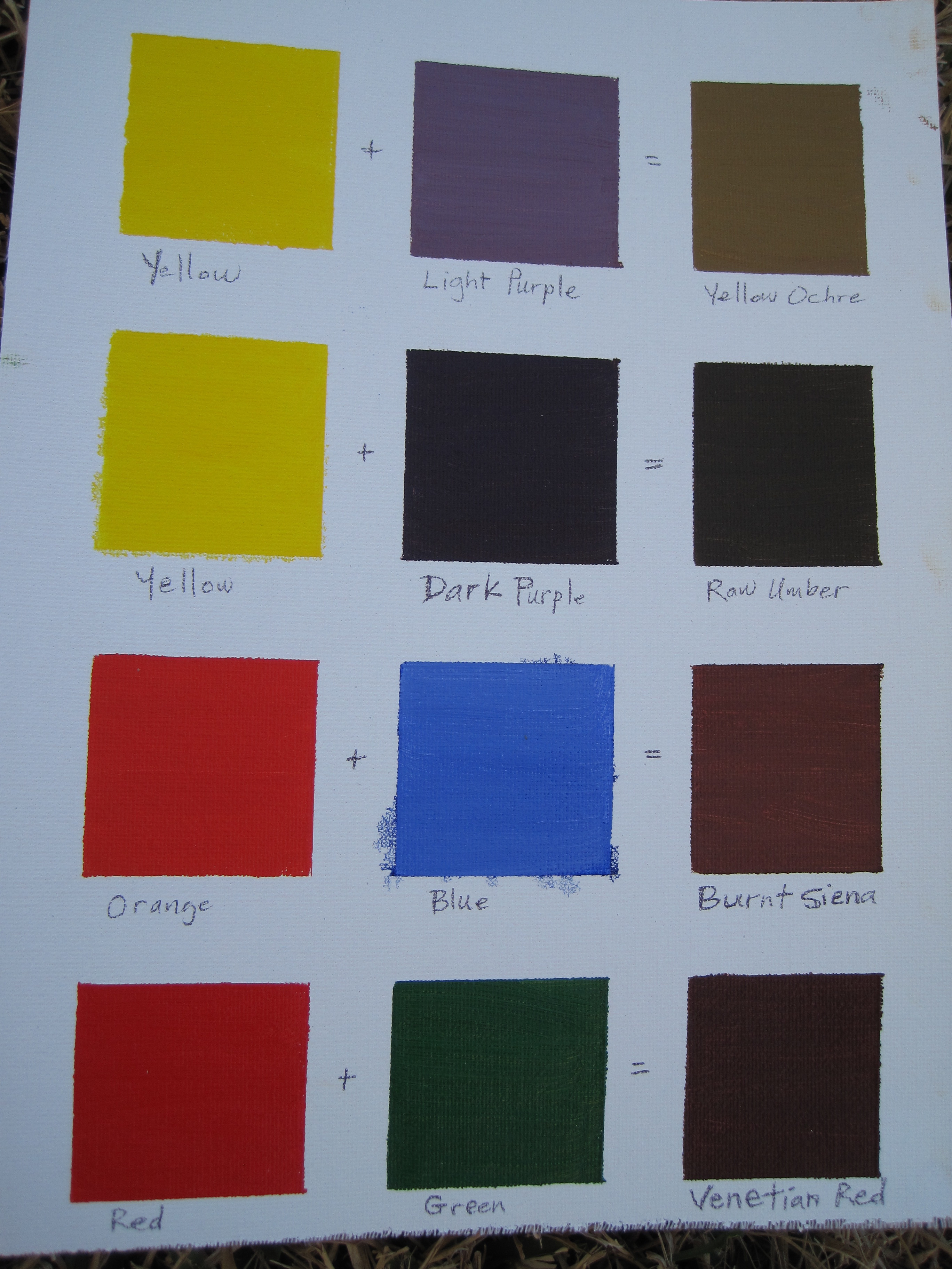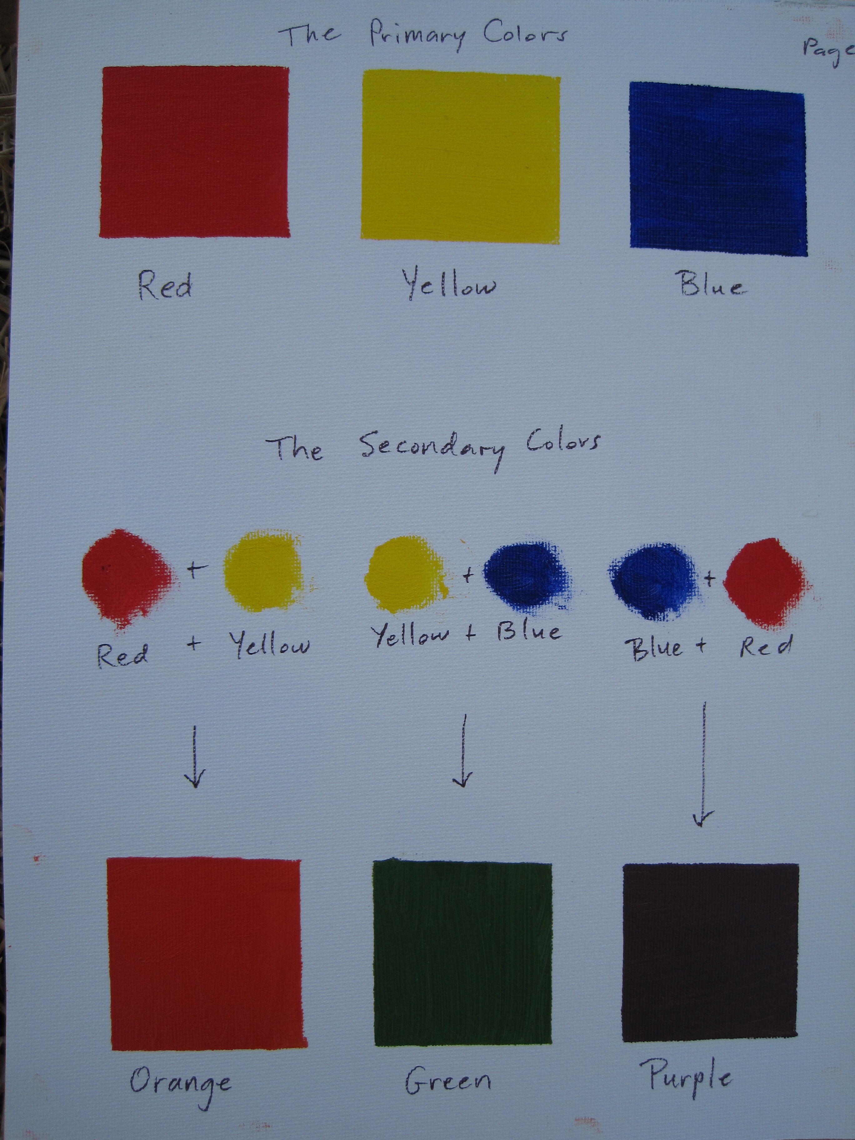 The first step was to take a look at the primary colors I had in my tubes of paint, and then to mix their secondary colors.