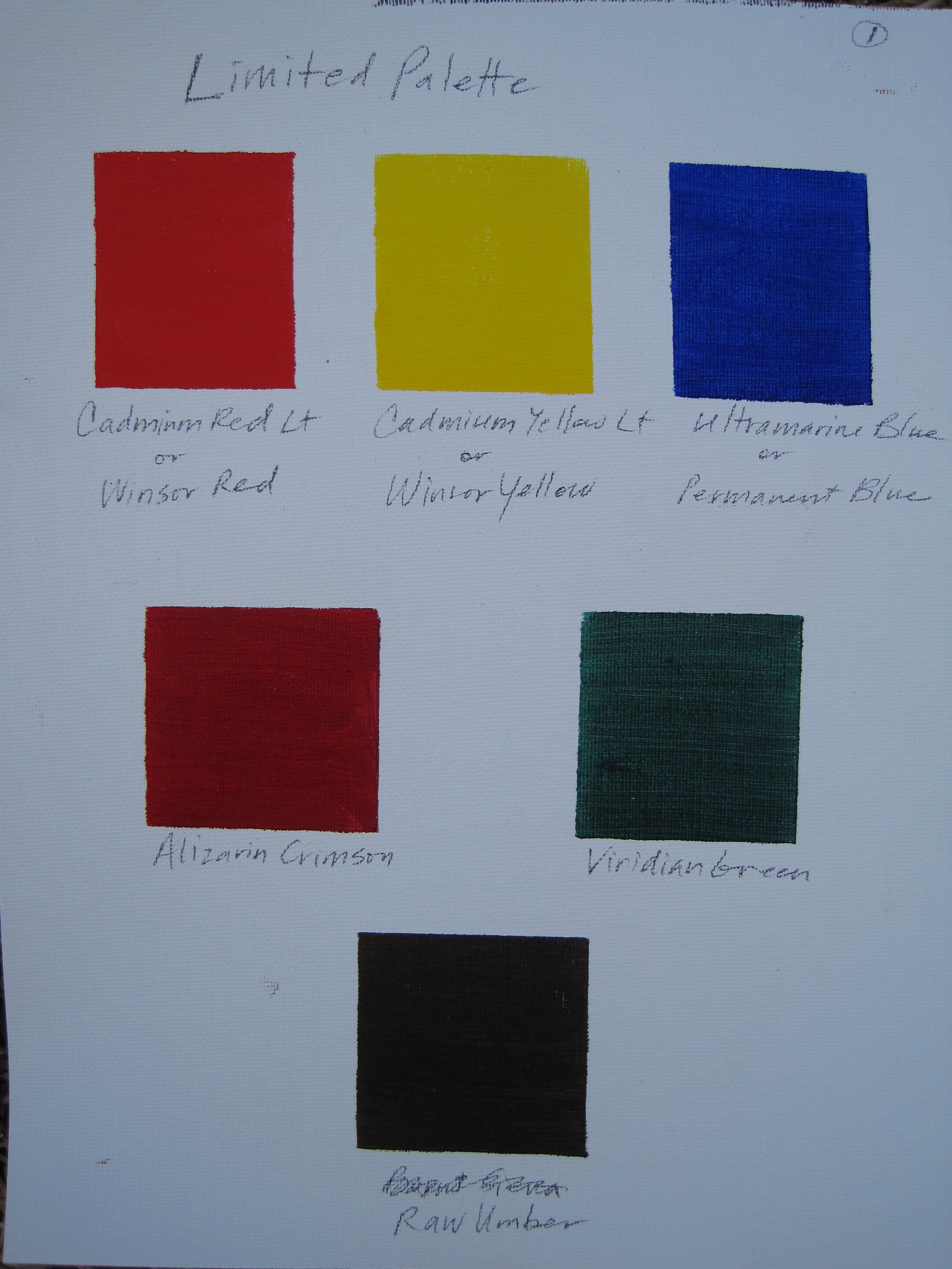 Next I made a patch of paint for every tube color I have, minus the white. This is so that I have my limited palette on one page. As a beginner, it’s best that I not start with too many colors before I’ve learned to master a few.
