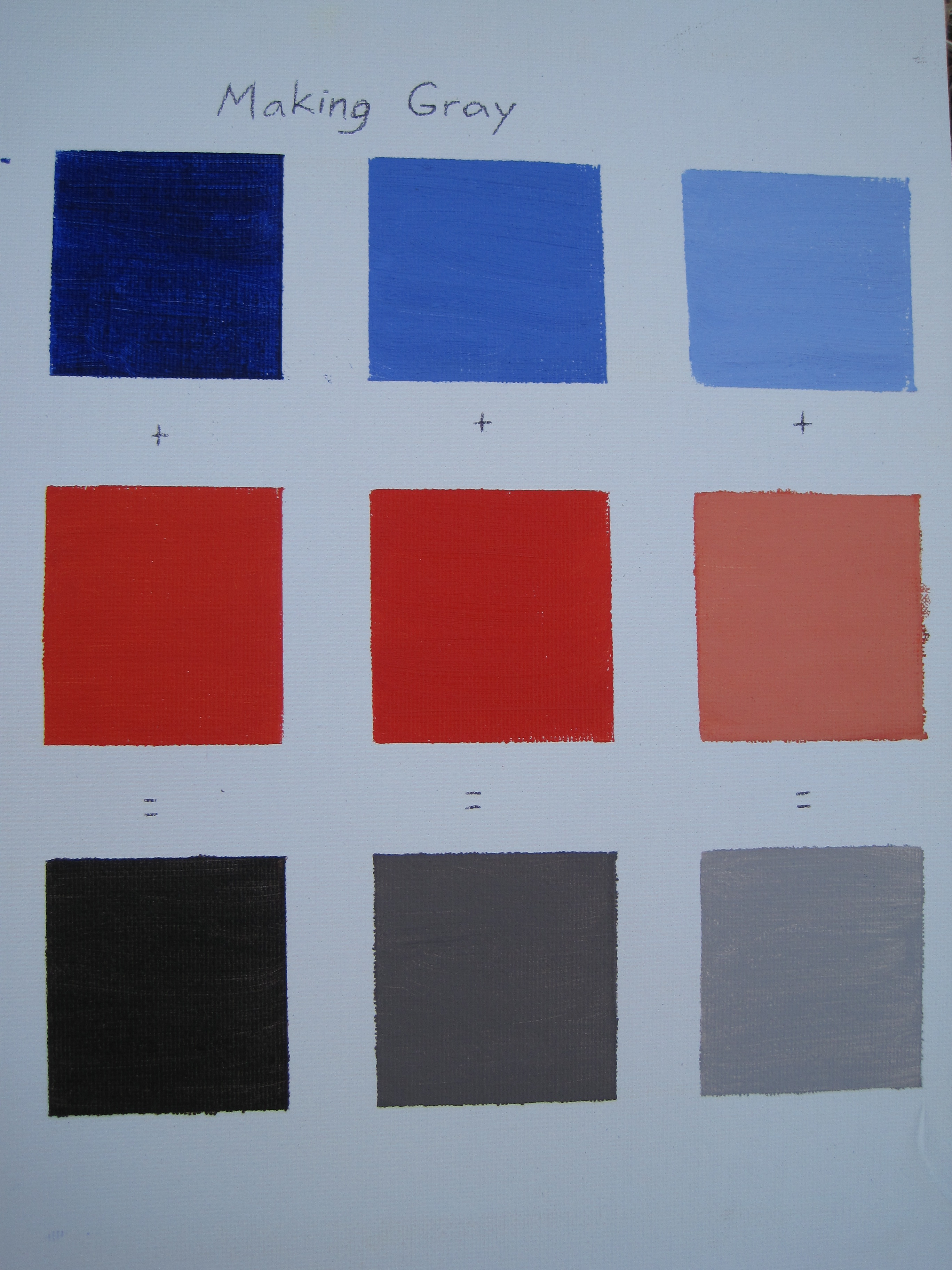 If we add two complementary colors to each other in equal amounts, they neutralize each other. Where this is useful in painting is to dull down the brightness of the original color to make it look like a color we actually see on earth. Above you see the (almost) perfectly neutral gray. As you head toward the center of the color wheel, the orange would get duller and duller until it hit gray, and then would cross the center to become a dull blue that brightened and brightened until it hit true blue on the other side. In the exact center of the wheel is gray.
