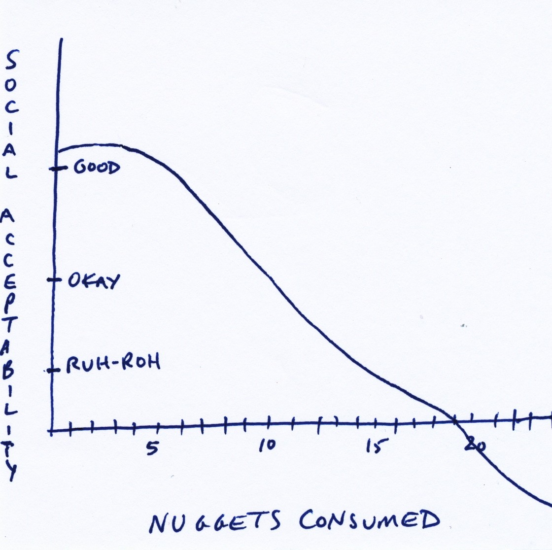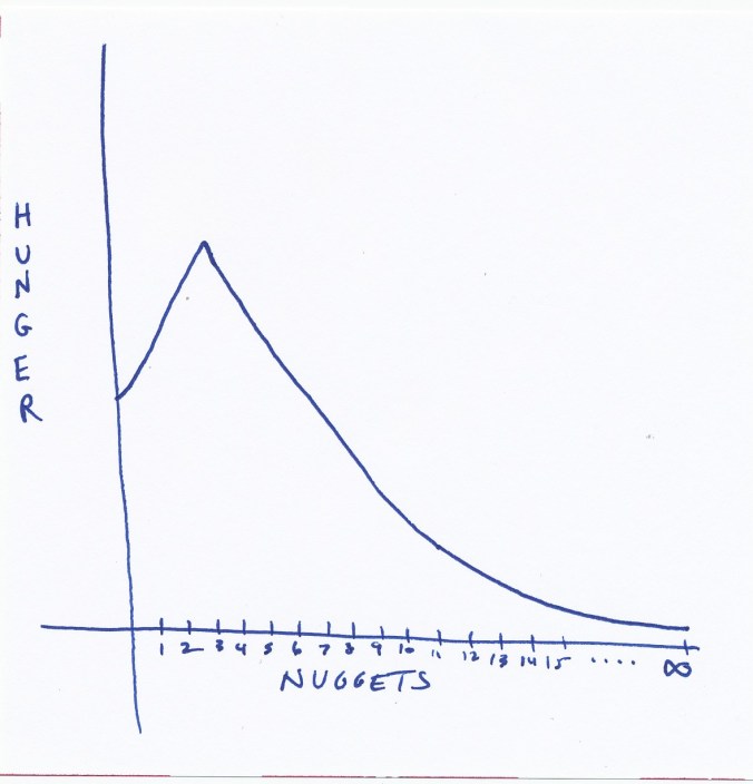 You’ll note that hunger actually spikes at the third nugget before steadily decreasing, only to flatline at a not-quite-full level as nuggets approach infinity.