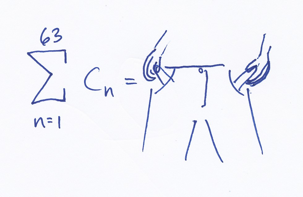 So how many nuggets could one realistically consume? I decided that a good limitation would be the amount of money in my pockets. I have $21. Given that Chick-Fil-A nuggets run about 34 cents each, the maximum amount I could consume would be 63. I have represented that as follows:
