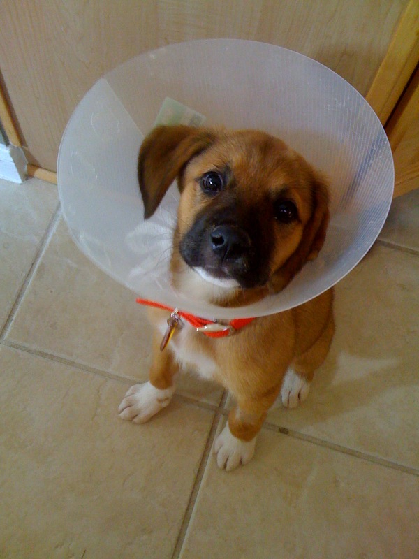 The ball of fur I adopted from the animal shelter decided it would be a good idea to wriggle her way through a wrought iron safety rail and jump four feet down onto a pile of river rocks in my back yard. She did not break any bones, but she did some damage to the spay the animal shelter had performed just five days earlier.