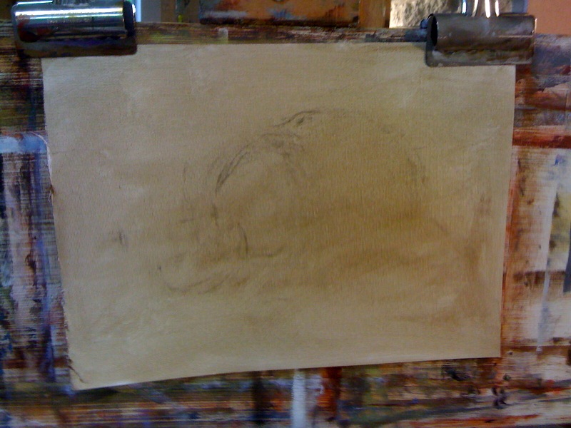 Now I had to spray the charcoal with hairspray (AquaNet, to be precise) so as to fix it to the canvas. Once it dried, I did a wash of raw umber oil paint and paint thinner to bring the canvas closer to the tone of the finished painting.