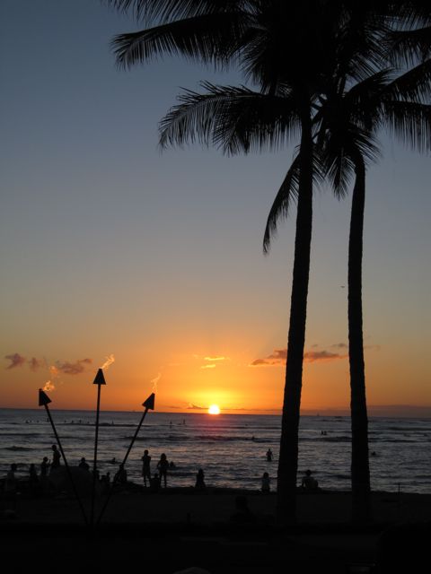 At Waikiki Beach in Honolulu, Oahu everyone stops to watch the sun set into the Pacific.