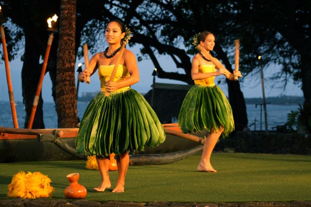 Girls hula in ti leaf skirts at a luau on Maui.