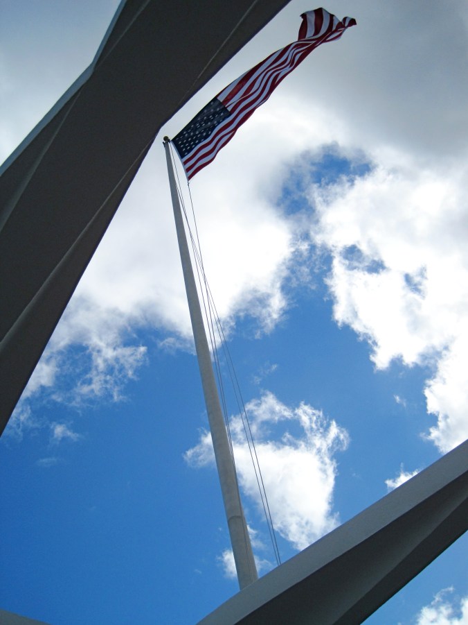 The flag flies over the U.S.S. Arizona Memorial at Pearl Harbor.